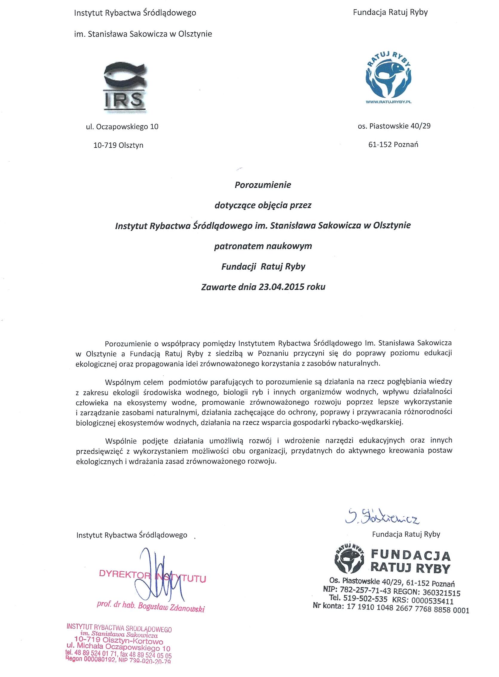 W dniu 10.04.2015 roku Instytut Rybactwa Śródlądowego im. Stanisława Sakowicza w Olsztynie objął patronatem naukowym Fundację  Ratuj Ryby. Porozumienie o współpracy ma na celu  poprawę poziomu edukacji ekologicznej oraz propagowanie idei zrównoważonego korzystania z zasobów naturalnych.
