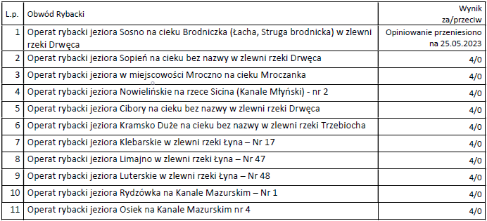 Informujemy, że dnia 27 kwietnia 2023 roku odbyło się posiedzenie Zespołu Opiniującego Operaty Rybackie. Opiniowane były operaty rybackie następujących obwodów: