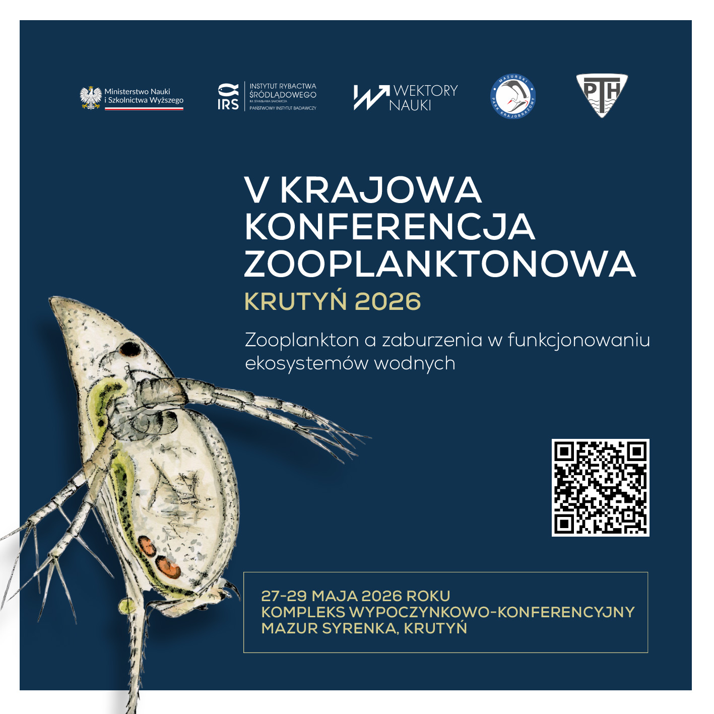 Z przyjemnością informujemy, że ruszyły zapisy na V Krajową Konferencję Zooplanktonową "Zooplankton a zaburzenia w funkcjonowaniu ekosystemów wodnych", która odbędzie się w dniach 27-29 maja 2026 roku w Krutyni. Będą to trzy dni spotkań, wykładów, dyskusji i zajęć w otoczeniu pięknej przyrody Mazurskiego Parku Krajobrazowego.