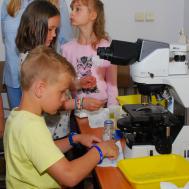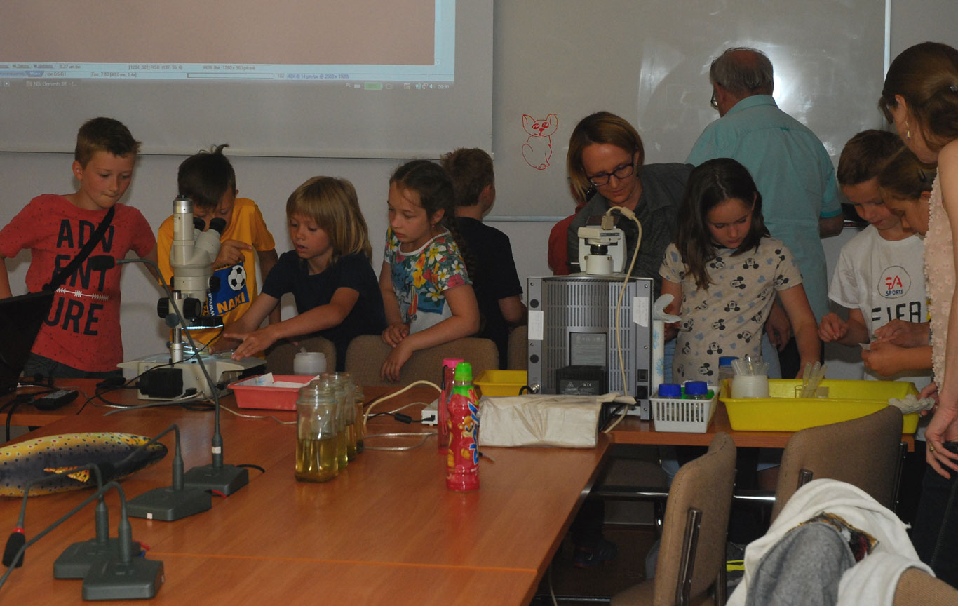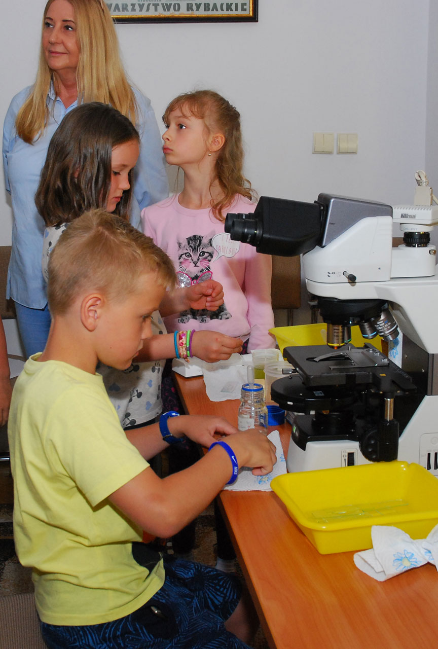 Na początku czerwca gościliśmy w Instytucie dzieci ze Szkoły Podstawowej nr 29 w Olsztynie, dla których zorganizowaliśmy warsztaty nt. „Ryby i wodne mikrostwory”. Rozpoczęliśmy pogadanką wzbogaconą kolorowymi prezentacjami na temat ryb, zooplanktonu i fitoplanktonu, w czasie której dzieci aktywnie uczestniczyły i chętnie zadawały pytania. W części praktycznej dzieci mogły samodzielnie przygotować preparaty i obejrzeć pod mikroskopem gatunki fitoplanktonu i zooplanktonu, jak również przyjrzeć się akwariowym i rodzimym gatunkom ryb. Bardzo przypadły im do gustu zwłaszcza jesiotry, z uwagą przysłuchiwały się informacjom dlaczego wyginęły i w jaki sposób staramy się je przywrócić do naszych wód. Największą frajdą dla dzieci było nakarmienie i dotknięcie jesiotrów. Trzecia, konkursowa część warsztatów, polegała na rozwinięciu wyobraźni i efektownym pomalowaniu woblerów, które specjalnie przygotowała firma Salmo. Trzy najładniejsze prace, wyłonione przez prof. B. Zdanowskiego i dr T. Czarkowskiego, zostały nagrodzone. Na zakończenie spotkania każdy z uczestników otrzymał pamiątkowy dyplom oraz upominek.